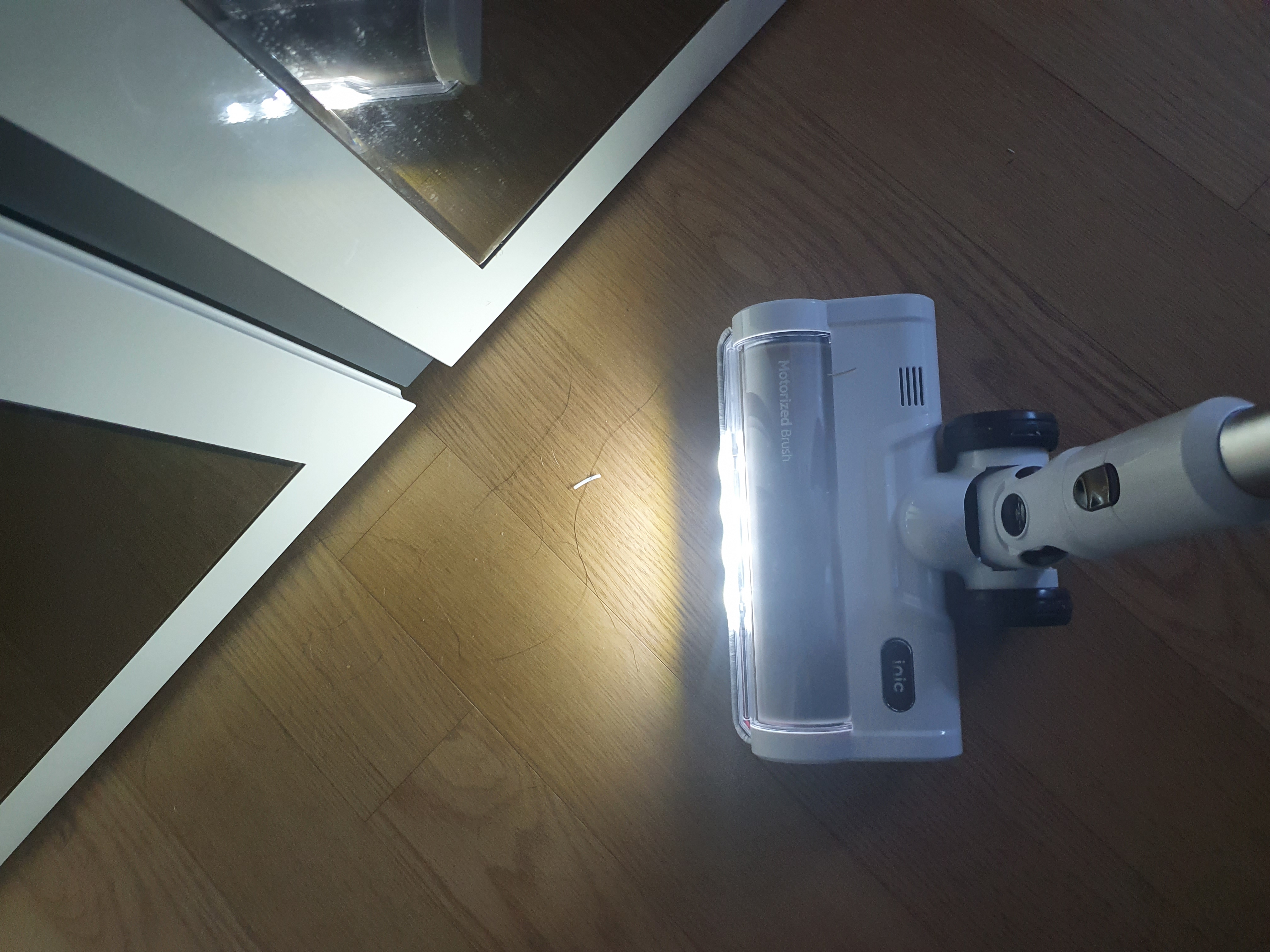 전원을 켜면 헤드에 불이 들어와 작은 먼지도 잘 비춰줍니다. 밝은 낮에도 큰 도움이 될까 싶었는데 도움 됩니다. 머리카락이나 강아지 털, 작은 먼지들까지도 잘 보입니다. 그리고 교체 헤드 중에 침구용 헤드에 소독등이 달려있어 패브릭 가구, 매트리스, 쿠션, 두꺼운 이불 등을 소독할 때 편하고 좋았습니다.