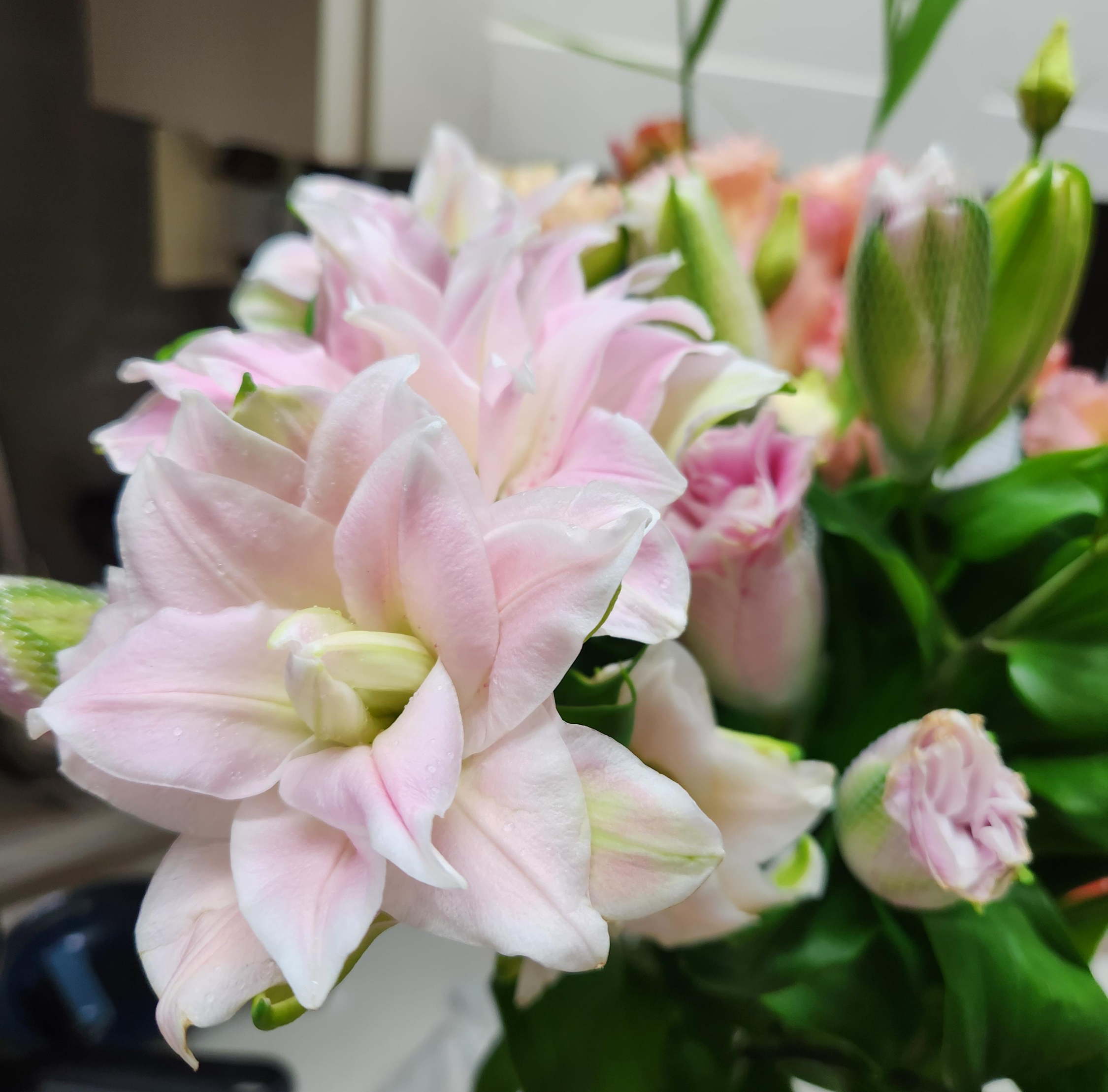 겹백합 1만, 나머지 꽃 다 합쳐서 2만, 사진엔 나오지 않았지만 화병 1.5만에 구매하고 집에서 화병 꾸밀때나 선물할 때 쓰려고 몇천원 주고 리본도 종류별로 조금씩 끊어서 구매해 왔습니다.