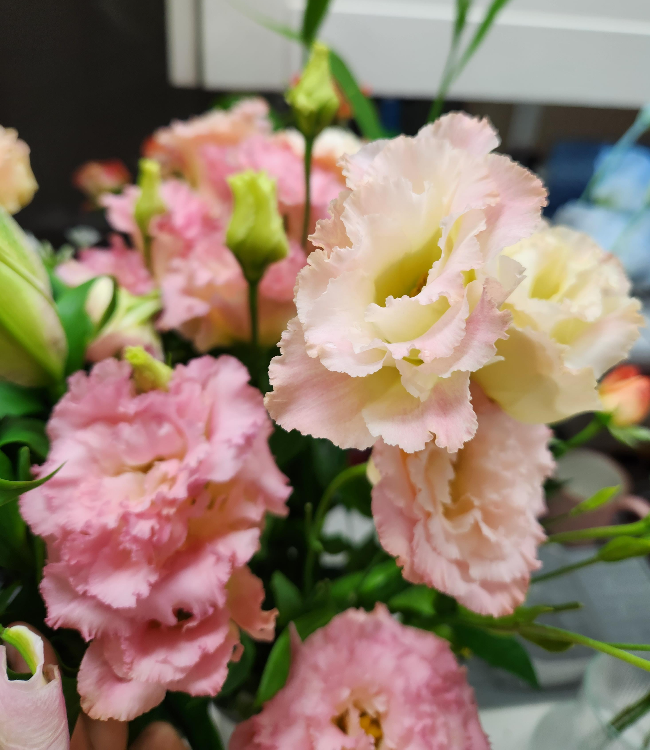 구매해 온 꽃들 소개해드리겠습니다. 오늘은 리시안셔스 색감이 정말 미쳤습니다. 전 이번에 분홍, 노랑 위주의 꽃을 구매하리라 마음먹고 갔지만 저 여리여리한 하늘색 리시안셔스에 마음을 빼앗겨서 조금 섞어서 샀습니다.