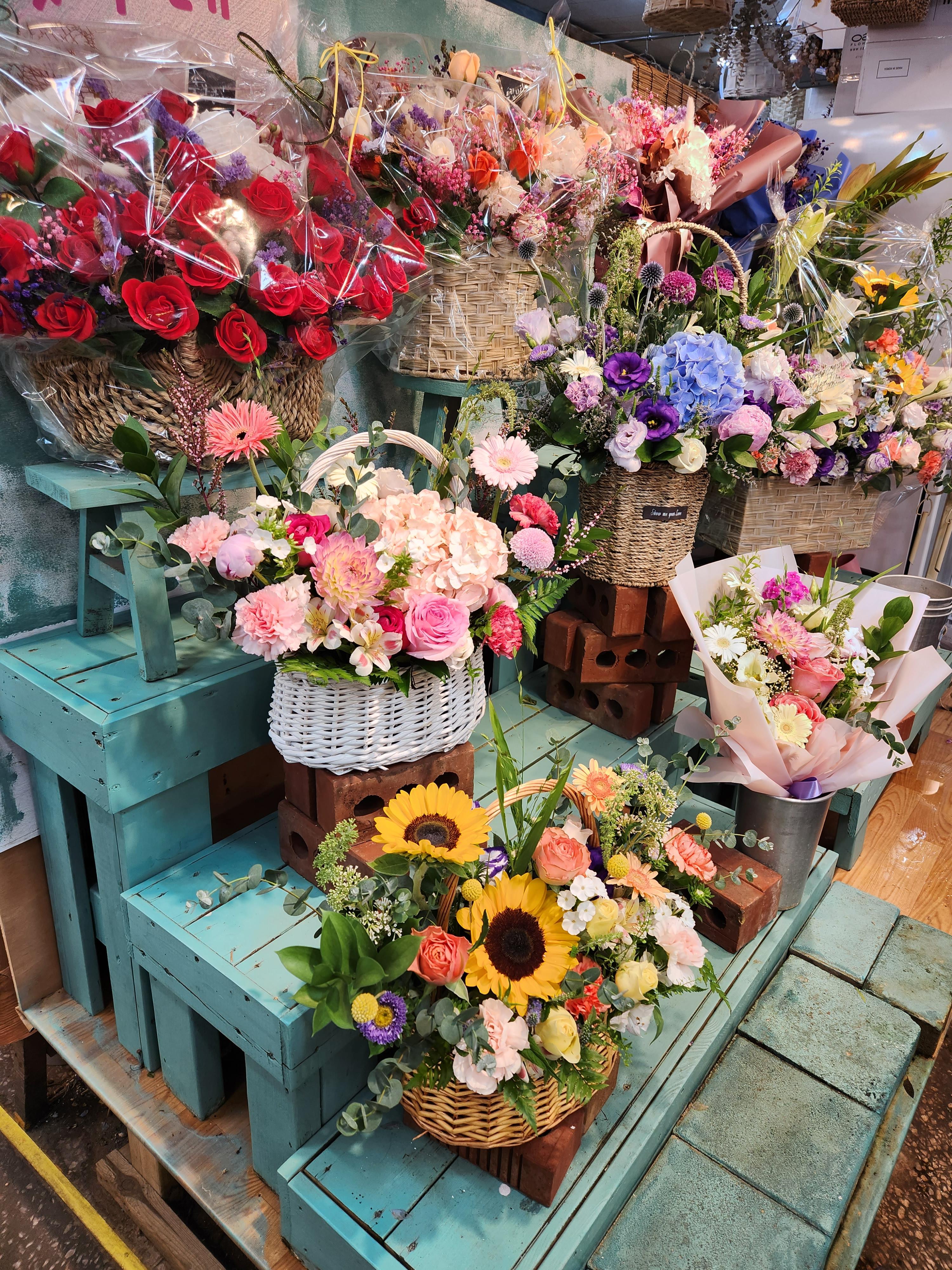 바로 사갈 수 있도록 꽃다발과 꽃바구니를 미리 만들어 두신 가게도 있습니다. 딱 만개해서 싱그러운 상태네요. 바구니 크기 별로, 꽃 색상별로 다양한 선택이 가능했습니다. 선물드리러 가기 직전에 사면 좋을 만개꽃들이었습니다.