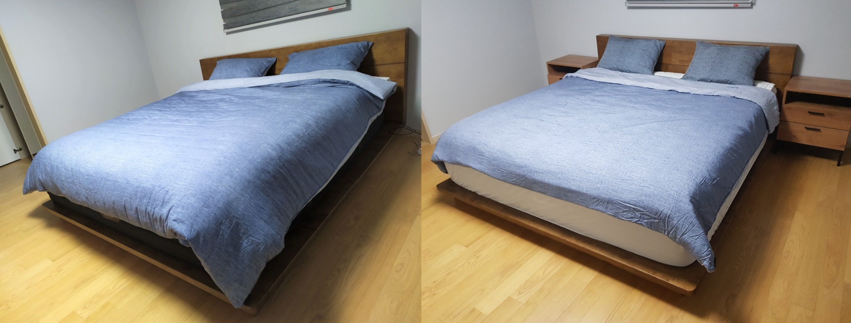 협탁이 있는 버전과 없는 버전의 세팅 모습입니다. 적당한 월넛컬러가 벽지 및 블라인드의 그레이톤과 잘 어울립니다. 컬러는 월넛과 네추럴 두가지 컬러가 있어 선택 가능합니다. 안정적인 디자인과 디테일에 만족한 프레임입니다.