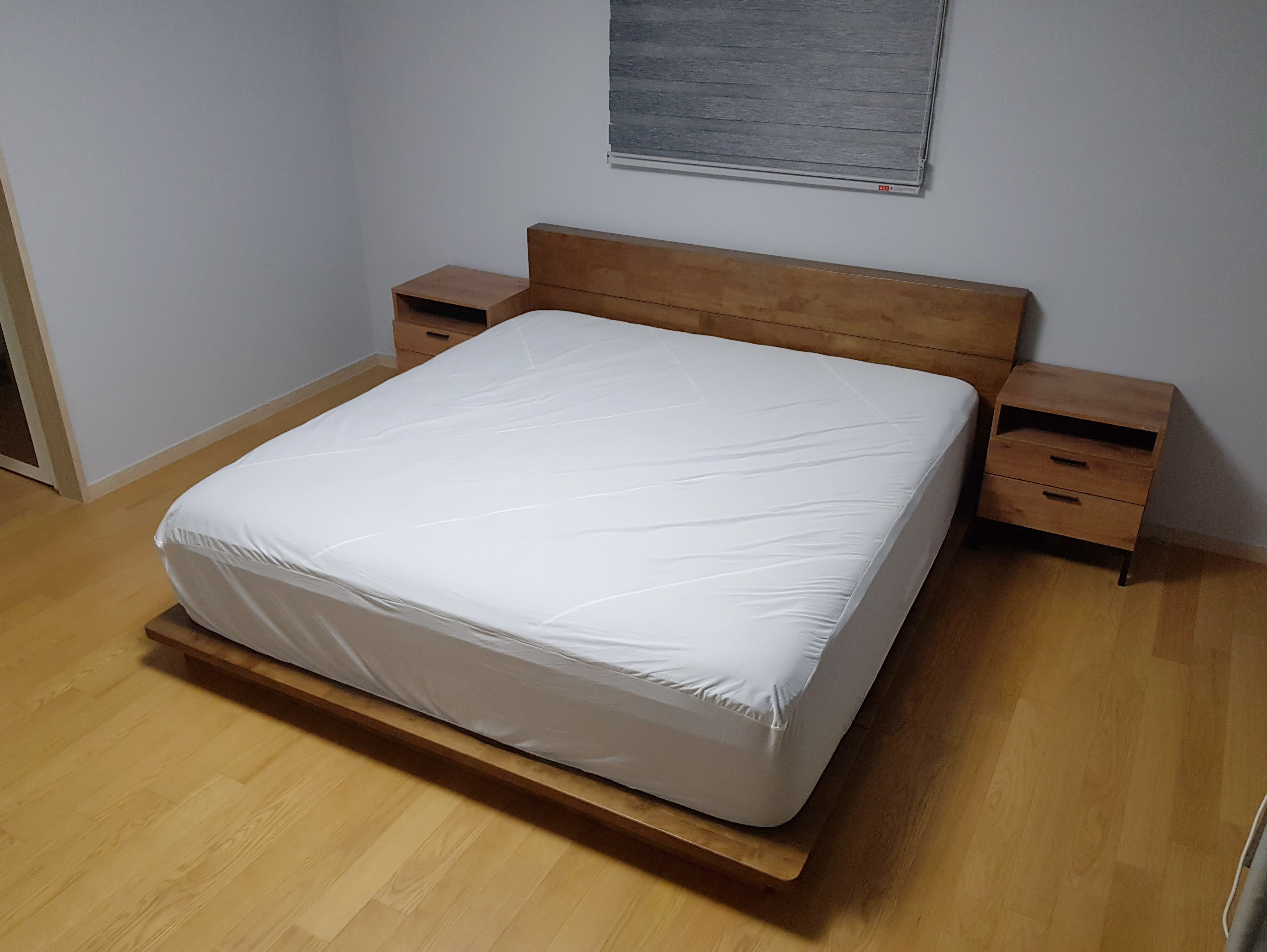 매트리스 커버를 씌우고 협탁을 놓아보았습니다. 여러 디테일없이 깔끔하고 좋았습니다. 협탁이 좀 큰 편이니 참고하고 봐주세요.
